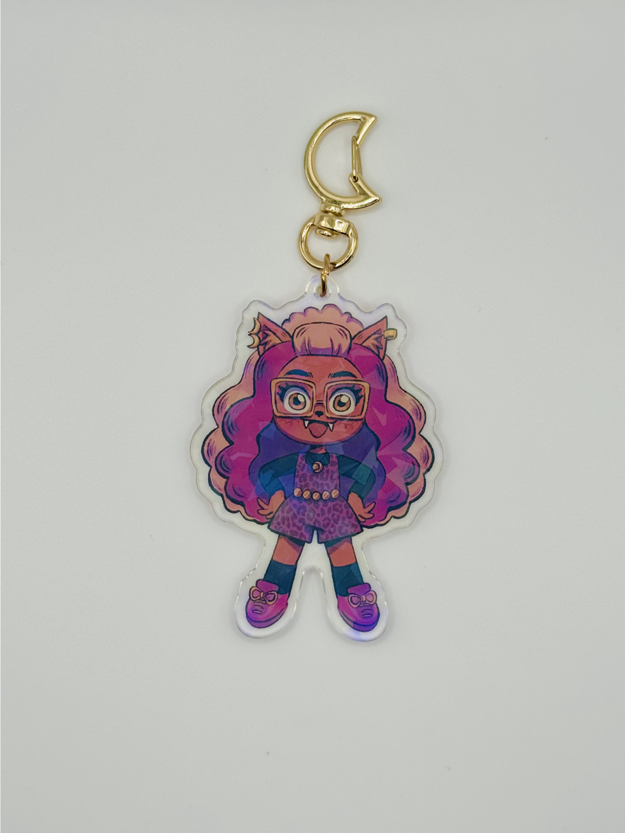 3 inch tall double-sided keychain of Clawdeen with a holographic broken glass effect. Clasp is a light gold crescent moon.