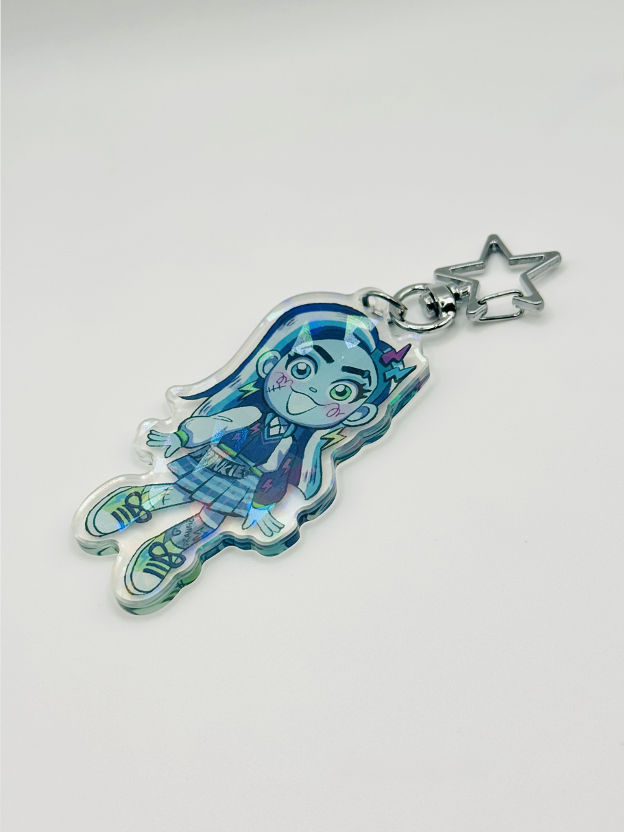 3 inch tall keychain of Frankie with a holographic broken glass effect on one side. Clasp is a silver star.