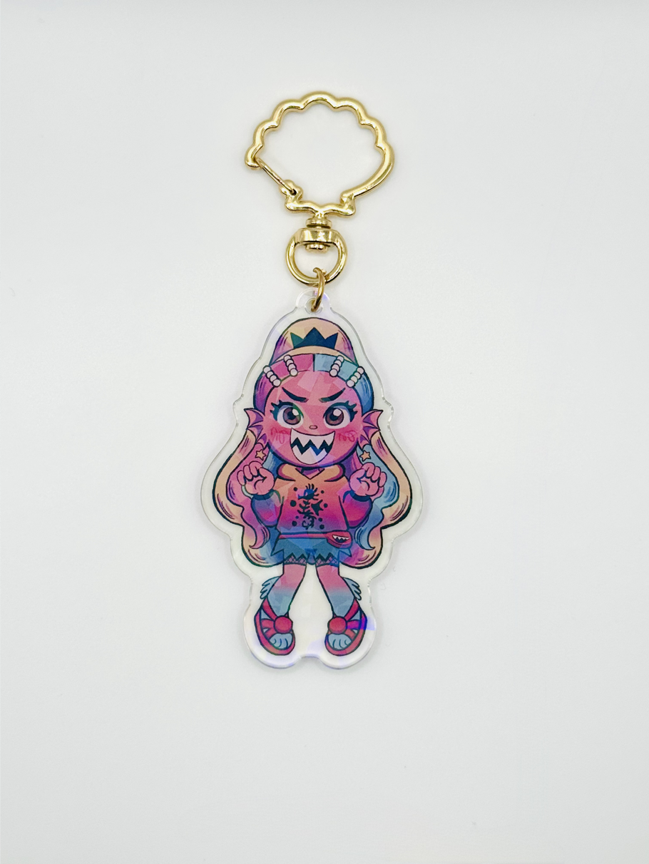3 inch tall double-sided keychain of Lagoona with a holographic broken glass effect. Clasp is a light gold seashell.
