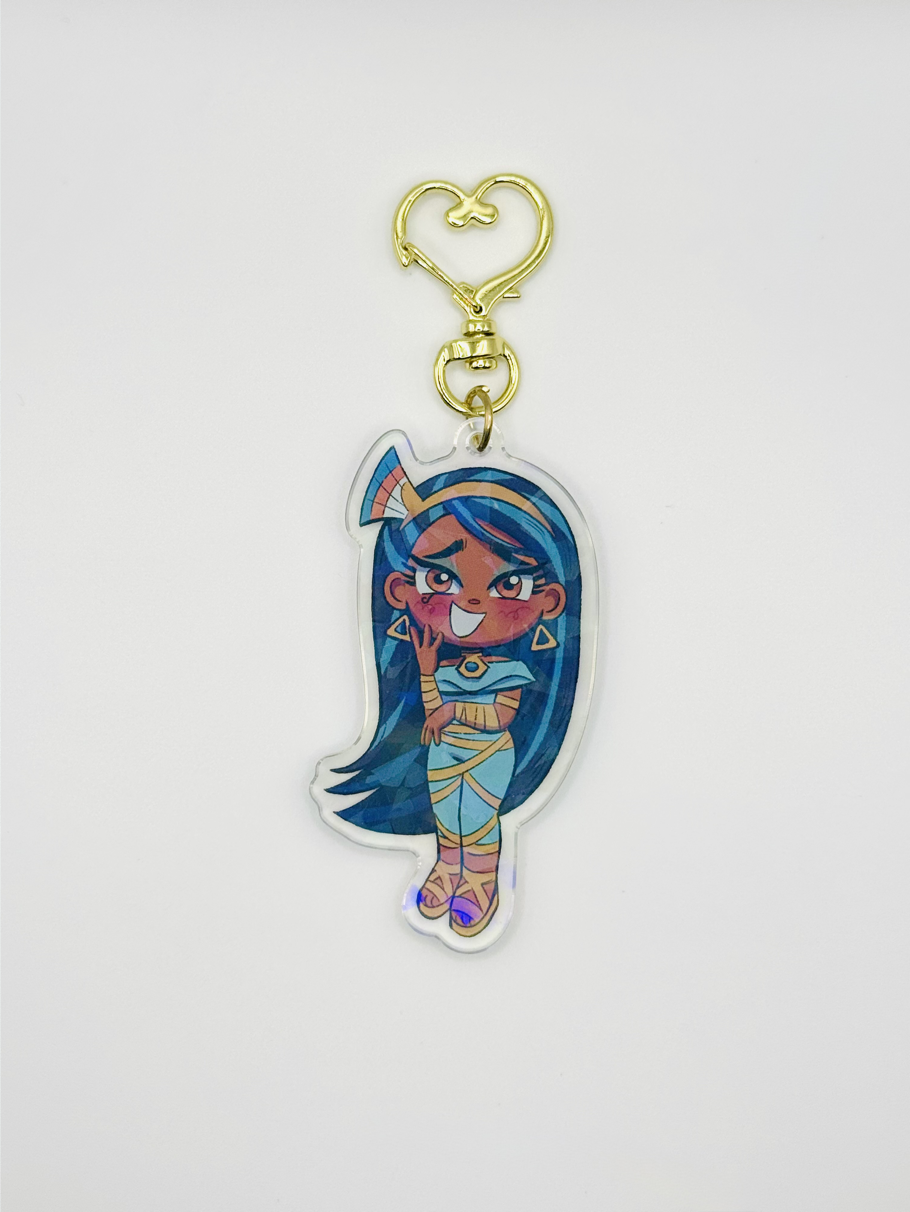 3 inch tall double-sided keychain of Cleo with a holographic broken glass effect. Clasp is a gold heart.