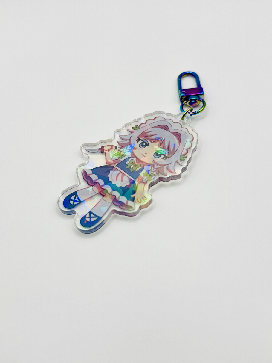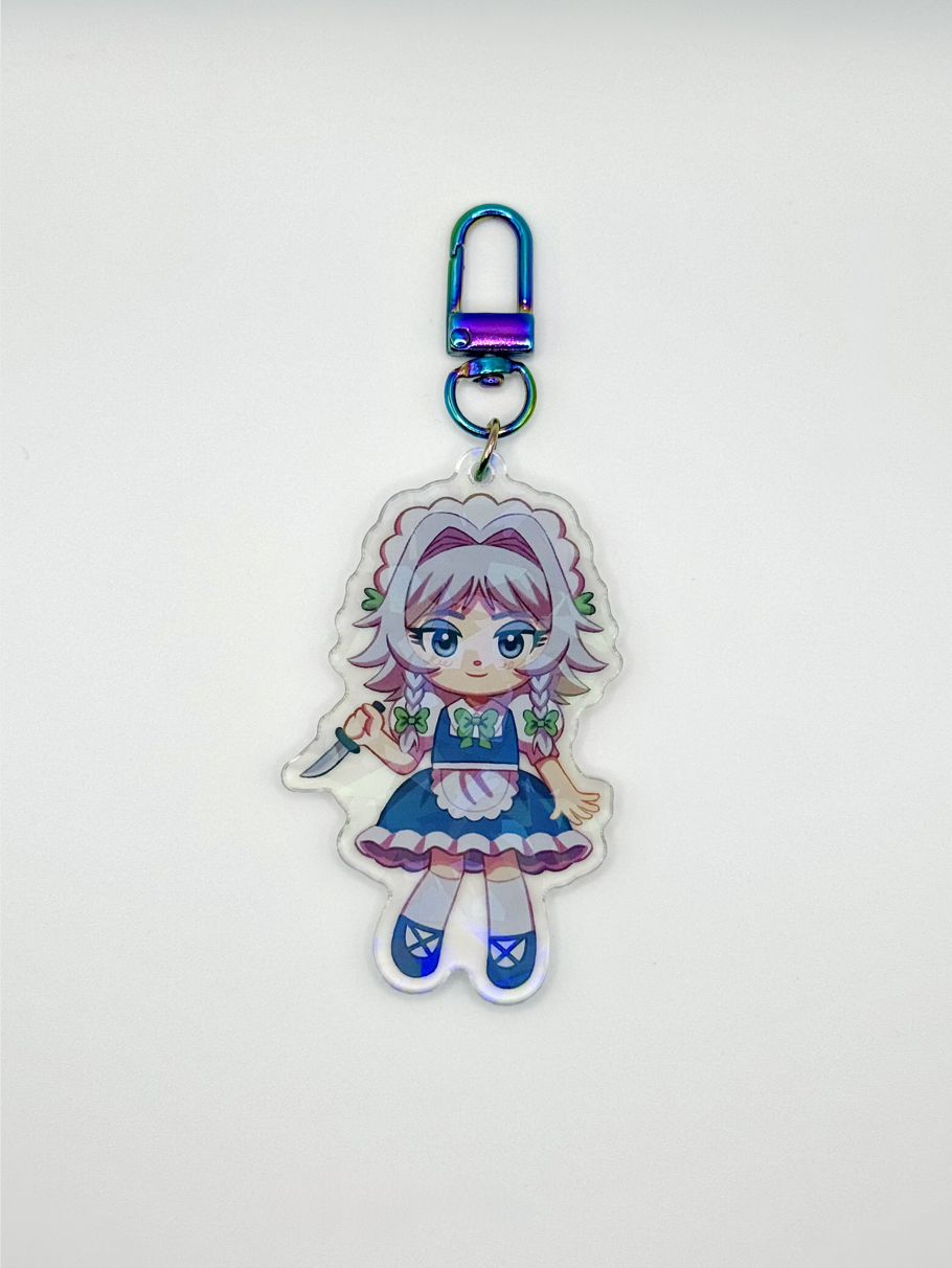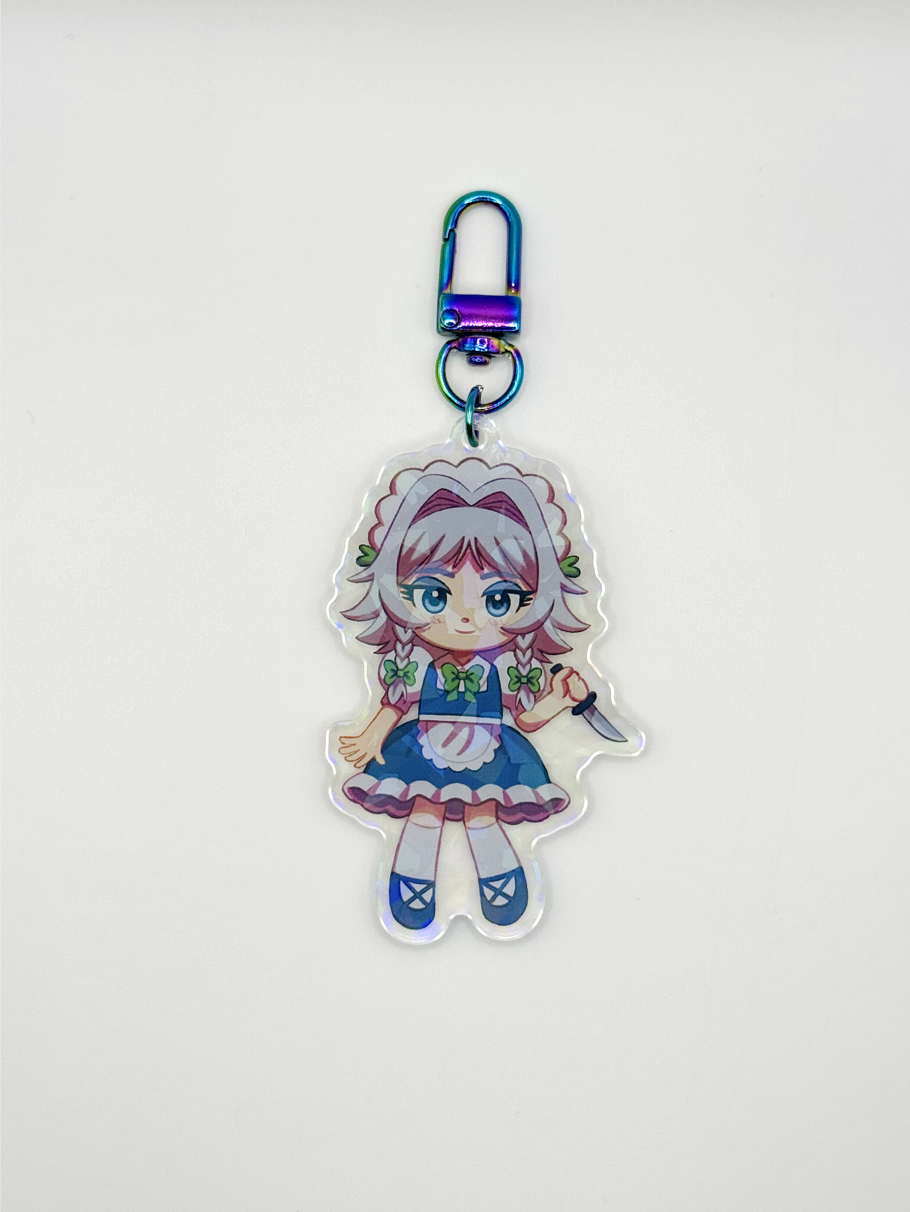 3 inch tall double-sided keychain of Sakuya with a holographic broken glass effect. U-Shaped iridescent clasp.